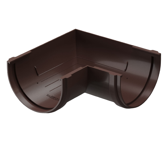 Угловой элемент 90 гр. соединяет желоба при прямых углах поворота карниза. Перенаправляет поток воды. Такой элемент часто используется на вальмовых крышах или на специальных архитектурных выступах.